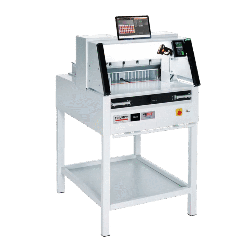 - Construcción de acero sólida y robusta de aproximadamente 250 kg con pies antivibración y alineadores de resma incluso para láminas de gran tamaño.